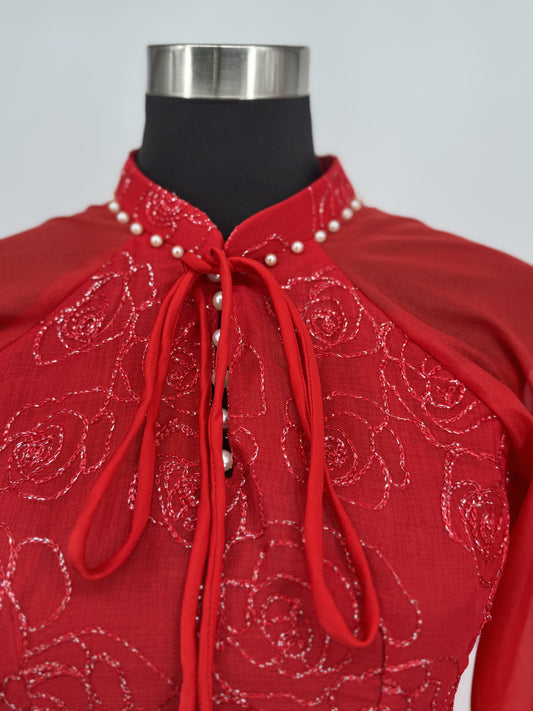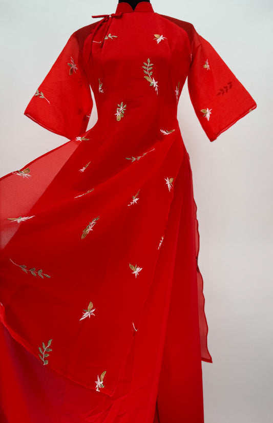 Áo + Quần | Áo Dài Nữ Đỏ Đính Nơ và Thêu Đẳng Cấp Từ Vải Lụa, Vải Voan | BA066