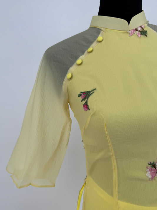 Áo + Quần | Áo Dài Nữ Vàng Thêu Hoa - Vải Lụa, Vải Voan Sang Trọng | BA080
