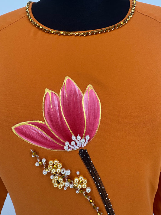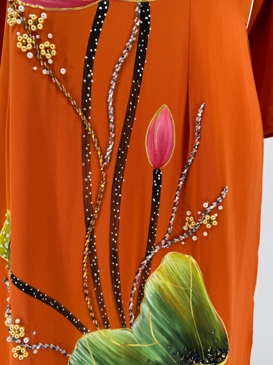 Áo + Quần | Áo Dài Nữ Cam Vẽ Tay Sang Trọng Kết Cườm | BA107