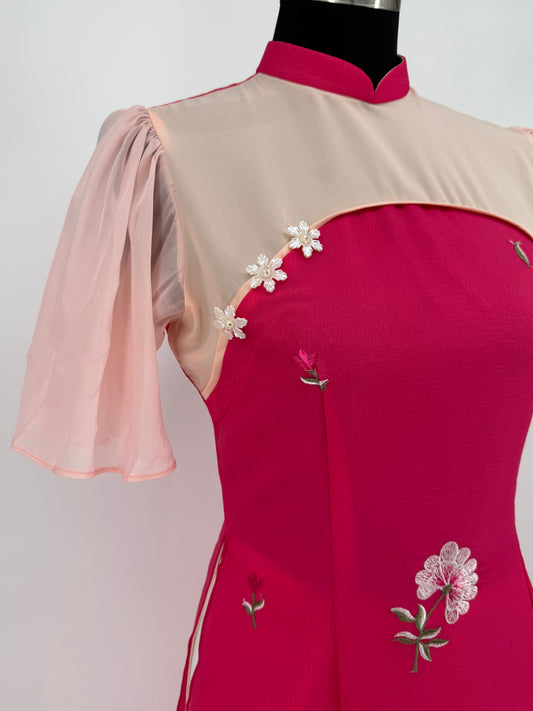 Áo + Quần | Áo Dài Nữ Hồng Đính Nơ, Thêu Tinh Tế - Vải Lụa & Voan | BA065