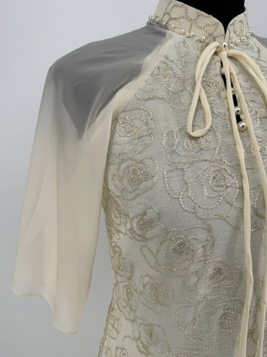 Áo + Quần | Áo Dài Nữ Kem Đính Nơ Thêu Cườm - Sang Trọng & Quyến Rũ | BA089