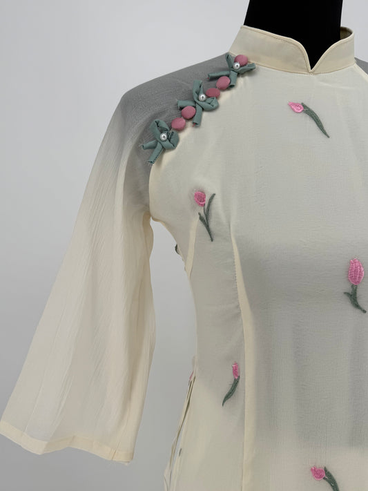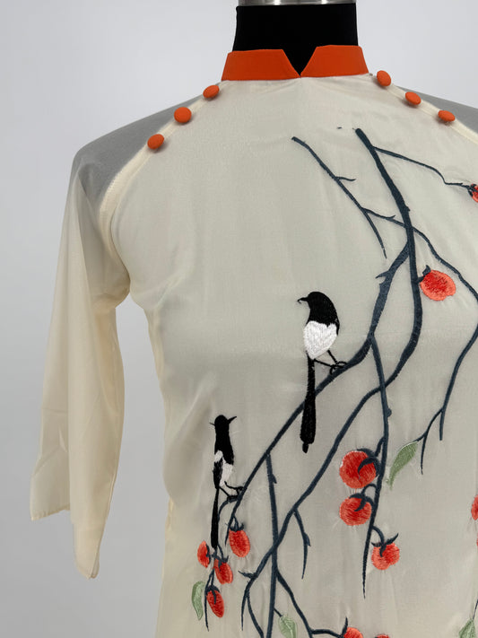 Áo + Quần | Áo Dài Nữ Kem 4 Tà, Cổ Truyền Thống, Thiết Kế Thêu Sang Trọng | BA014