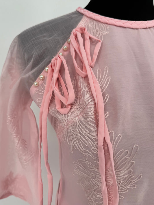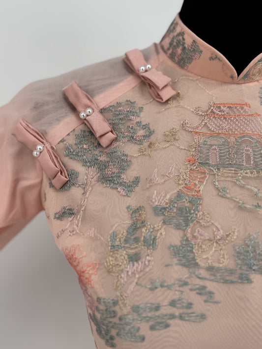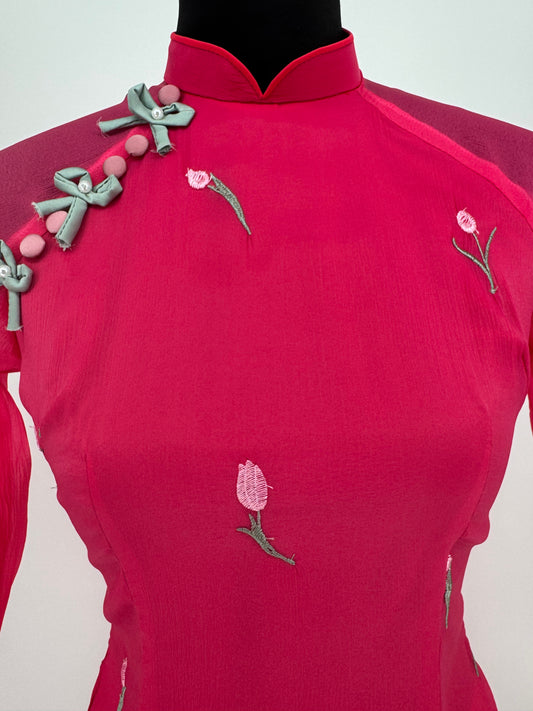 Áo + Quần | Áo Dài Nữ Hồng Dính Nơ Thêu Tinh Tế Vải Chiffon & Lụa | BA039