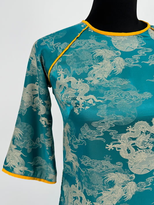 Áo + Quần | Áo Dài Nữ Xanh Vải Gấm Sang Trọng, Cổ Tròn, Tay Lửng | BA017