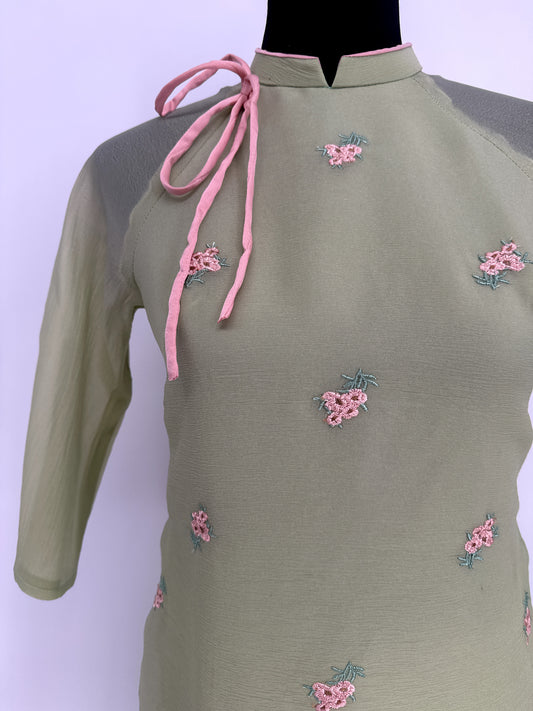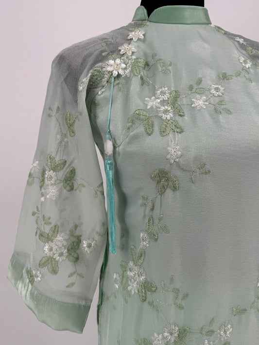 Áo + Quần | Áo Dài Nữ Xanh Đính Nơ Thêu Vải Lụa & Voan Sang Trọng | BA031