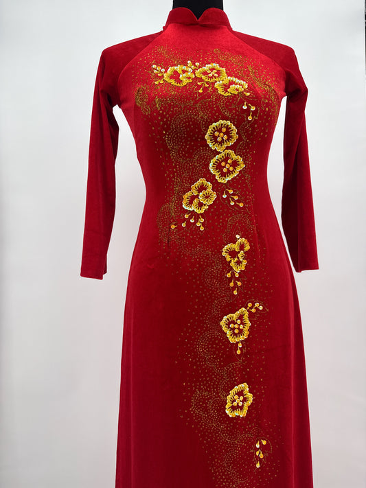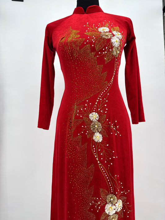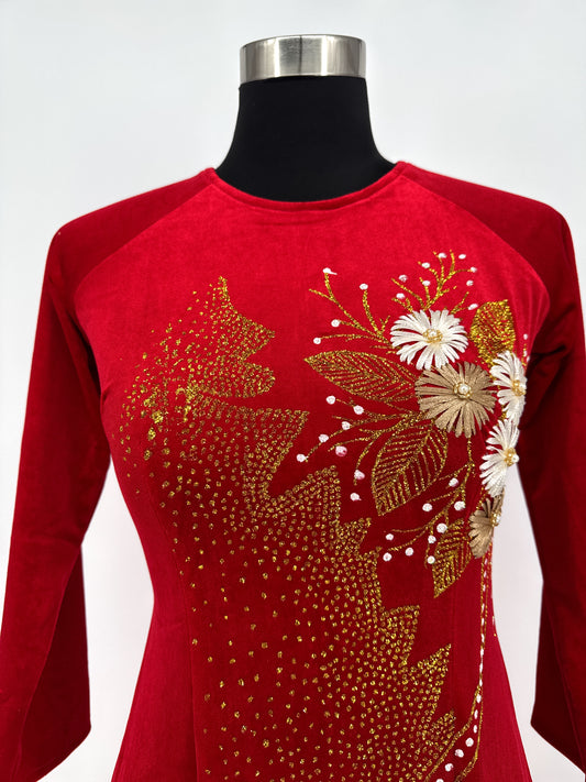 Shirt (No Pants) | Luxurious Red Velvet Ao Dai for Women with Embroidered Flowers for Evening Party | BA327